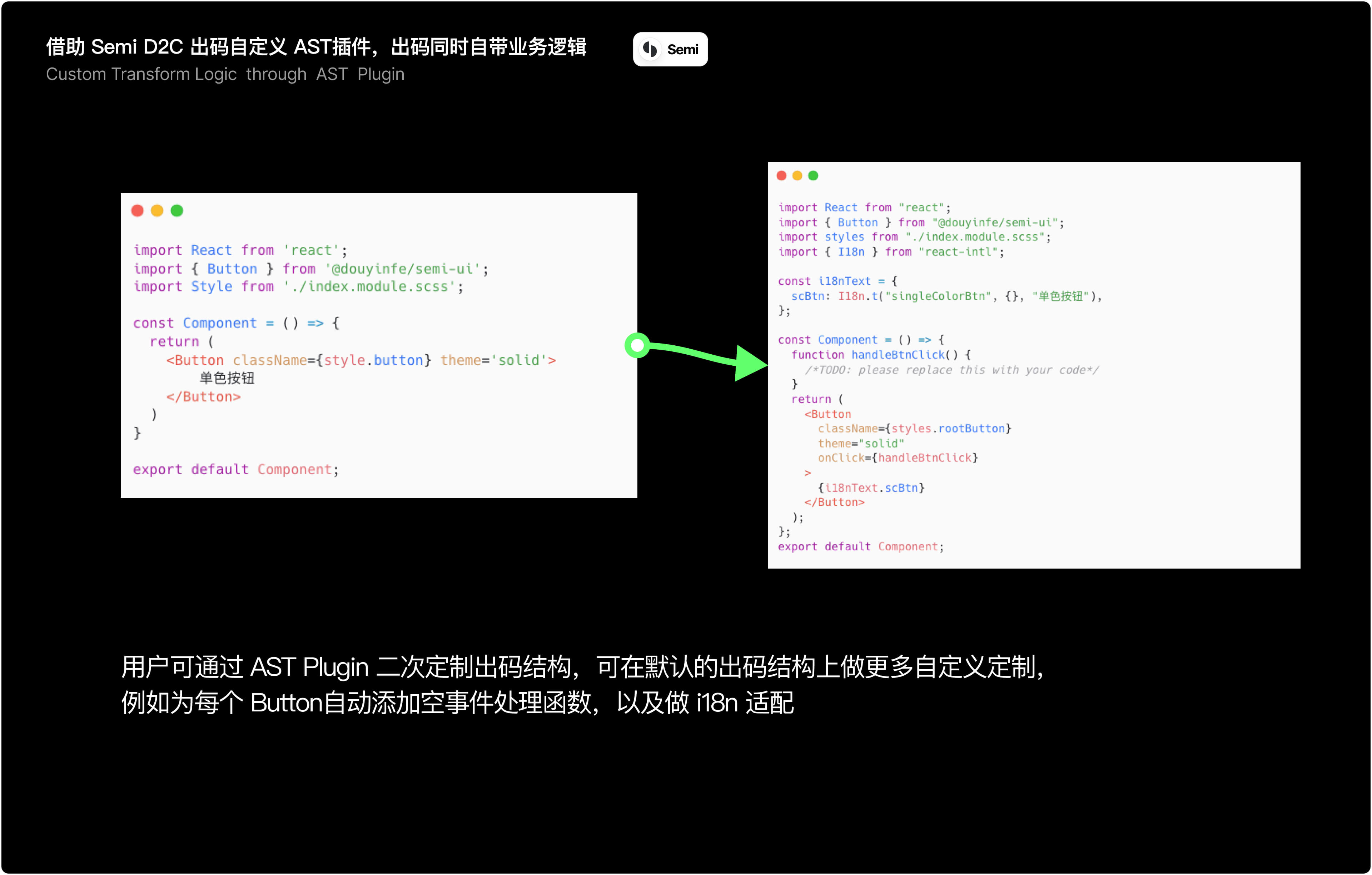 Semi D2C支持了通过转码插件实现自定义转码产物 (https://semi.design/code/zh-CN/d2c/transform-plugin),即你可以通过编写一个自定义的 AST Plugin,对 Semi D2C的原始出码产物(JSX/CSS Code 或 JSON Schema)进行二次编辑,可用于添加自定义的业务逻辑,例如: